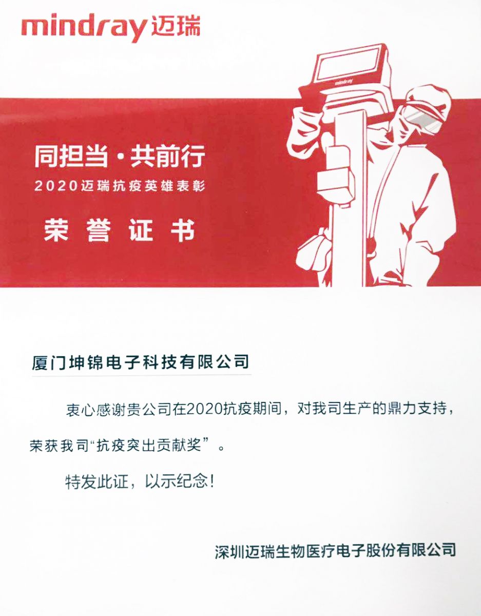 当2020年初冠状病毒疫情袭来时,对监护仪、呼吸机等疫情关键医疗器械需求量急剧增加,而坤锦是该类产品使用的泵阀的核心供应商,配套国内外顶级及大部分重要厂商。面对客户的紧急召唤,坤锦应声而动。我司于从农历初五开始组织相关人员到岗发货并克服困难提前开工。公司高层基于医疗行业需求态势,预判大部分医疗行业客户需求量会增长两至三倍,开始组织人力资源、后勤部、生产等部门积极应对,一边做好公司本身的防疫工作,同时有条不紊地安排人员招聘、产线增加,在疫情初期根本无法招聘到新员工的情况下,坤锦管理干部积极投入一线生产中,无条件满足客户的交期需求。面对众多客户时刻变化的需求,坤锦全力应对,保质保量保时效,不让客户失望。时至今日,疫情稳定,荣获客户深圳迈瑞授予的荣誉,身为坤锦人,很自豪能为疫情抗击尽绵薄之力!
